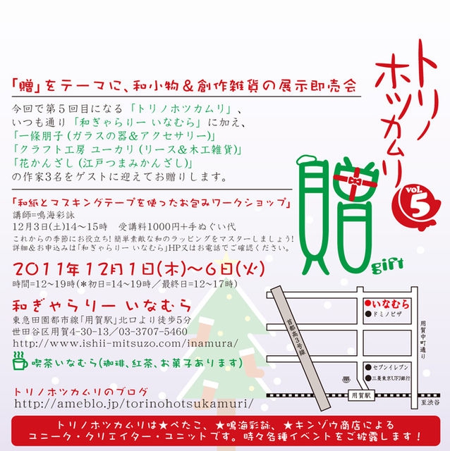 ●今回で第5回目になる「トリノホツカムリ」、いつも通り「和ぎゃらりー いなむら」に加え、「一條朋子(ガラスの器&アクセサリー)」「クラフト工房 ユーカリ(リース&木工雑貨)」「花かんざし(江戸つまみかんざし)」の作家3名をゲストに迎えてお贈りします。